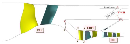 This study is based on a self-designed medium variable bypass ratio engine compression system, as depicted in Figure 1. Compared with a conventional small bypass ratio variable cycle compression system [], the novel variable medium bypass ratio compression system eliminates the mode selection valve at the fan outlet and exhibits a distinct mode transition mechanism; moreover, it features a larger bypass ratio. By introducing the CDFS, the compression system forms an aerodynamic structure with double bypass characteristics and can regulate its bypass ratio to adapt to various actual working conditions. During high-speed cruising or acceleration, the CDFS variable inlet guide vane (VIGV) is open, and the engine operates in low bypass mode (LB) by channeling a large flow rate though the core engine to achieve sufficient thrust. Conversely, during low-speed cruising, the engine switches to high bypass mode (HB), and the CDFS VIGV is closed, resulting in a reduced load and flow rate of the CDFS. More flow passes through the second outer bypass, while the front variable area bypass inlet (FVABI) assists in adjustment. As a result, the entire engine’s bypass ratio increases, leading to reduced fuel consumption. In conclusion, the advanced medium bypass ratio engine possesses a multi-connected aerodynamic layout and numerous adjustable components, necessitating further exploration of its underlying internal flow mechanisms and corresponding matching criteria.