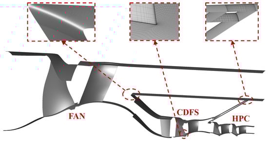 As shown in Figure 1, the medium variable bypass ratio compression system studied in this paper consists of three compressive components, namely the fan, CDFS, and high-pressure compressor (HPC). Both the fan and CDFS have single-stage structures, with the CDFS utilizing its VIGV to achieve a wide range of flow control. Considering that the matching of the core engine of the compression system primarily depends on the front stage of the HPC, this paper simplifies the original three-stage axial flow plus one-stage centrifugal HPC and only uses the first two stages of the HPC for the matching study between the HPC and other components.