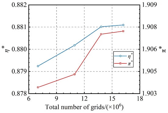Figure 5 illustrates the variation of the total pressure ratio and adiabatic efficiency of the CDFS in the compression system with respect to the grid density. The computational results demonstrated that an increase in the grid density leads to an improved adiabatic efficiency and total pressure ratio of the CDFS. However, the effects of further increasing the grid density on the performance metrics become increasingly limited after the grid density exceeds 13.82 million. This trend suggests that the aerodynamic performance tends towards stabilization, and that the grid densities are sufficient for accurately solving the overall aerodynamic performance of the components in the compression system.