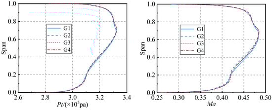 In order to investigate the inter-coupling of complex flows within the compression system and accurately determine the overall performance of the system components, it is essential to precisely capture the details of the flow field. Figure 6 compares the radial distribution patterns of the CDFS outlet total pressure and absolute Mach number for different numbers of computational grids.