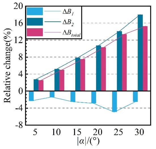 Figure 7 illustrates the variations in B1, B2, and Btotal during the adjustment process of the CDFS VIGV. As the CDFS VIGV closes, B1 exhibits an overall decreasing trend followed by an increasing trend. Meanwhile, B2 and Btotal increase with closure of the CDFS VIGV, with increases of 18.05% and 15.29%, respectively, observed when αVIGV = −30°. The growth rate of Btotal is somewhat reduced due to the influence of B1. Overall, it can be concluded that the variation in B2 plays a dominant role in the changes observed in Btotal.