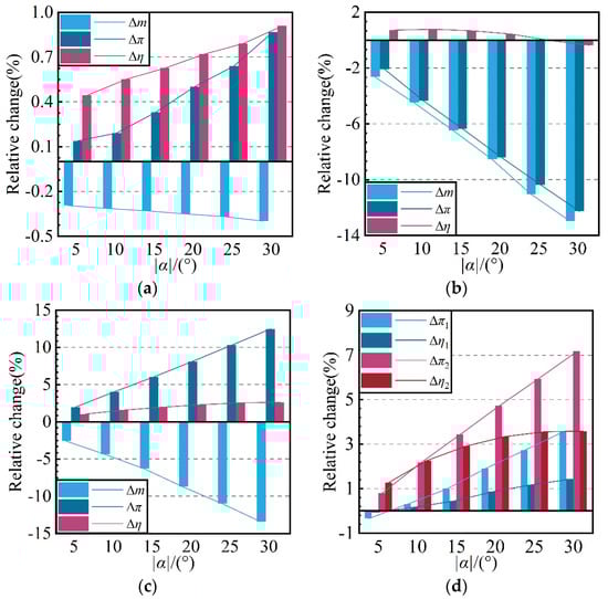 where Cp and Tt respectively represent the specific heat ratio of the gas at constant pressure and the total temperature, Lu represents the rim work, and U and Wu respectively represent the circumferential components of the absolute and relative velocities. Equation (7) reveals that the elemental stage pressure ratio is essentially determined by both the twist speed of the airflow (∆Wu) and the efficiency (η) of the elemental stage. In combination with the velocity triangle analysis discussed earlier, it can be inferred that the closure of the CDFS VIGV leads to an overall reduction in blade height twist velocity, therefore causing a decline in the CDFS rotor’s pressure ratio.
