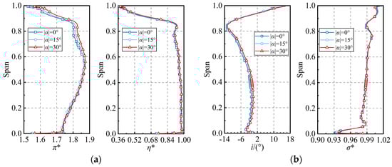 The radial distribution of the aerodynamic performance of the fan rotor and stator under different CDFS VIGV openings. (a) Fan rotor, (b) fan stator.