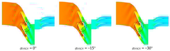 Figure 23a,b shows the distribution patterns of the relative Mach number of the CDFS at the 95% and 5% of the blade height sections under different FVABI openings. It can be seen that under different FVABI openings, the position and intensity of the first leading edge-detached shock wave remain unchanged, while the intensity of the second passage shock wave slightly increases with the increase in FVABI opening, and there is no significant change in the flow field structure at the CDFS tip. According to the change pattern of the flow field at the blade root, with the increase in FVABI opening, the flow separation on the pressure side of the CDFS stator root becomes more severe, and the corresponding total pressure loss at the stator root becomes larger.