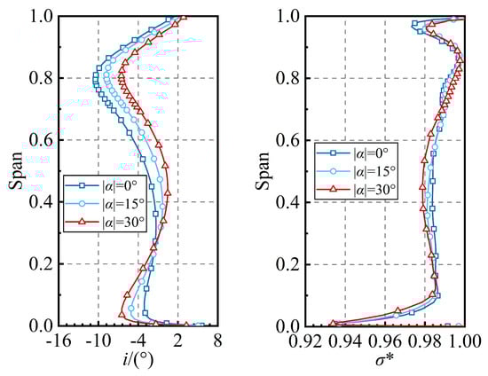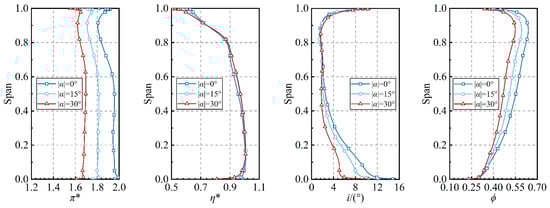 The radial distribution of the aerodynamic performance of the CDFS stator under different CDFS VIGV openings.