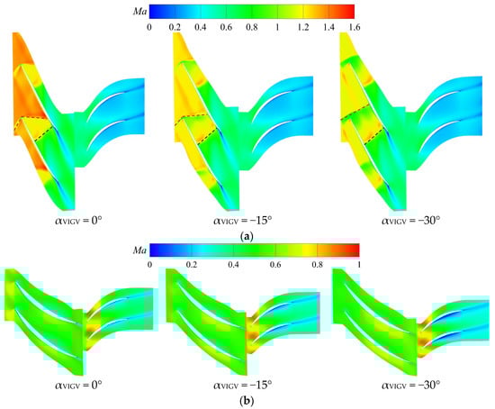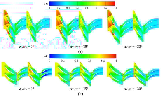 The distribution of the relative Mach number at the 95% and 5% of the blade height sections of the CDFS under different CDFS VIGV openings. (a) The 95% of the blade height section of the CDFS, (b) the 5% of the blade height section of the CDFS.