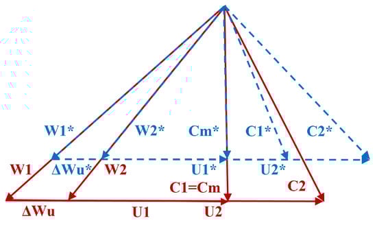 In order to elucidate the underlying mechanism by which the closure of the CDFS VIGV affects the performance of the rotor, Figure 14 affords a comparison between the velocity triangles at the elemental stages of the rotor before and after VIGV adjustment. It is discernible that the closure of the VIGV causes an augmentation in the absolute flow angle at the rotor inlet (C2→C2*), which induces a reduction in the twist velocity of the rotor under isobaric and iso-circumferential velocity conditions (Wu→Wu*). According to the definition of adiabatic efficiency and principle of energy conservation, the correlation among the velocity triangles at the elemental stages, pressure ratio, and efficiency is explicitly expounded, as evidenced in Equation (7):