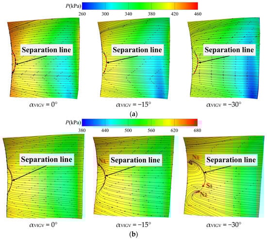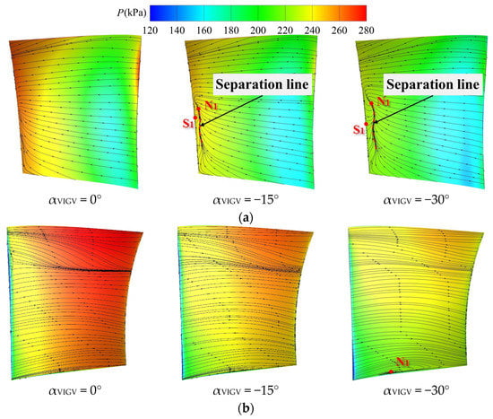The distribution of static pressure and limit streamlines on the suction and pressure surfaces of the HPC stator under different CDFS VIGV openings. (a) The suction surface of the first-stage stator of the HPC, (b) the suction surface of the second-stage stator of the HPC.