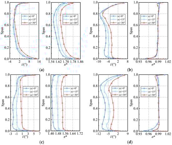 The radial distribution of the aerodynamic performance of the first- and second-stage rotors and stators of the HPC under different CDFS VIGV openings. (a) The first-stage rotor of the HPC, (b) the first-stage stator of the HPC, (c) the second-stage rotor of the HPC, and (d) the second-stage stator of the HPC.