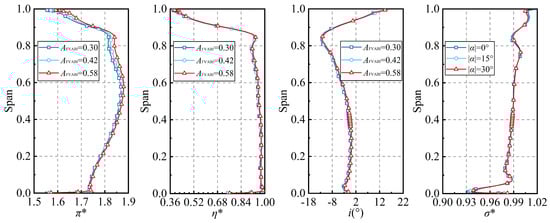 In order to analyze the effects of FVABI regulation on the compression system bypass ratio and component aerodynamic performance, this study defines the variation of the compression system performance under different FVABI openings, with AFVABI set to 0.30 as the baseline state: