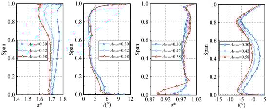 The radial distribution patterns of the average aerodynamic parameters of the fan rotor under different FVABI openings are presented in Figure 21. With the increase in FVABI opening, the pressure ratio of the fan rotor continuously increases in the area above 40% of the blade height, while it remains basically unchanged in the remaining blade height range, and the efficiency is basically unaffected by the change in FVABI opening. Additionally, the incidence angle and total pressure recovery coefficient of the fan stator are not sensitive to the change in FVABI opening, which is similar to the effect mechanism of CDFS VIGV regulation on the aerodynamic characteristics of the fan.