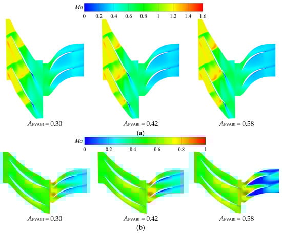 The distribution of the relative Mach number at the 95% and 5% of the blade height sections of the CDFS under different FVABI openings. (a) The 95% of the blade height section of the CDFS, (b) the 5% of the blade height section of the CDFS.