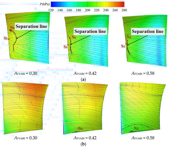 Figure 24 presents the distribution patterns of static pressure and limit streamlines on the suction and pressure surfaces of the CDFS stator under different FVABI openings. It can be observed that when the FVABI opening is small, the low-energy fluid on the hub of the CDFS stator is lifted upward by the radial force of the blade and interacts with the backflow from the trailing edge to form a concentrated separation vortex. With the increase in FVABI opening, the core of the concentrated shedding vortex disappears, and the scale of the separation region on the suction surface of the CDFS stator is reduced. On the contrary, increasing the FVABI opening widens the scale of the separation region at the root of the stator pressure surface, indicating that opening the FVABI will further exacerbate the blockage at the CDFS stator root.