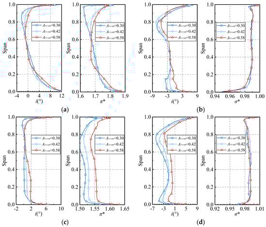 The radial distribution of the aerodynamic performance for the first and second stage of the HPC under different FVABI openings. (a) The first-stage rotor of the HPC, (b) the first-stage stator of the HPC, (c) the second-stage rotor of the HPC, (d) the second-stage stator of the HPC.