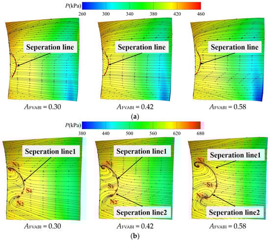 The distribution of static pressure and limit streamlines on the suction and pressure surfaces of the HPC stator under different FVABI openings. (a) The suction surface of the first-stage stator of the HPC, (b) The suction surface of the second-stage stator of the HPC.