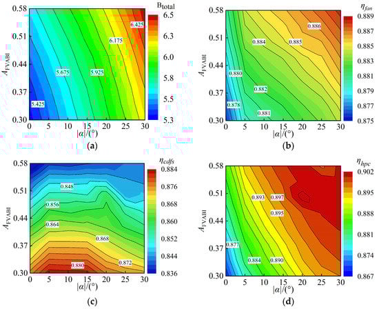 The variation in the overall aerodynamic performance of the HPC with respect to the FVABI opening is shown in Figure 20c. As the FVABI opening increases, the flow rate of the HPC gradually decreases, while its efficiency and pressure ratio increase. The increment in pressure ratio is significantly higher than that in efficiency, and both of their growth rates slow down as the FVABI opening further increases. When AFVABI = 0.58, the increase in pressure ratio reaches 4.06%, while the increase in efficiency is only 0.46%. Figure 20d further presents the variation in the total pressure ratio and adiabatic efficiency of the first two stages of the HPC. The calculation results indicate that, during the gradual opening of the FVABI, both the pressure ratio of the first two stages of the HPC and efficiency of its first stage continuously increase, while the efficiency of its second stage exhibits a trend of first increasing and then decreasing.