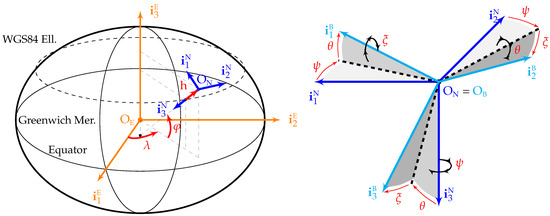 - The time derivative of the geodetic coordinates (longitude, latitude, and altitude) depends on the ground velocity per (A1), where M and N represent the WGS84 ellipsoid radii of curvature of meridian and prime vertical, respectively. The Jacobian with respect to , given by (A2) and employed in (20), is hence straightforward: