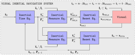 Their obtainment relies on the current visual state generated by the visual system, the one obtained with the previous frame , as well as the estimated state = = corresponding to the previous image generated by the inertial system. Note that as = = , the relationship between i and n is as follows, where is the number of inertial executions for every image being processed (Table 1):