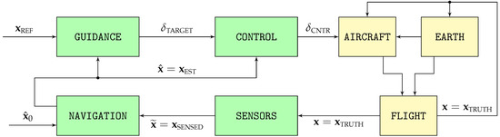 - The second, represented by the green blocks on the left, contains the aircraft systems in charge of ensuring that the resulting trajectory adheres as much as possible to the mission objectives. It includes the different sensors whose output comprises the sensed trajectory , the navigation system in charge of filtering it to obtain the estimated trajectory , the guidance system that converts the reference objectives into the control targets , and the control system that adjusts the position of the throttle and aerodynamic control surfaces so the estimated trajectory is as close as possible to the reference objectives . Table 1 lists the working frequencies of the various blocks represented in Figure 4.