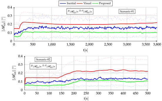 - As exemplified by the two scenarios employed to evaluate the algorithms, the proposed approach can cope with heavy turbulence, which increases the platform accelerations as well as the optical flow between consecutive images. Although not discussed in the results, the turbulence level has a negligible effect on the navigation accuracy as long as it remains below a sufficiently elevated threshold.