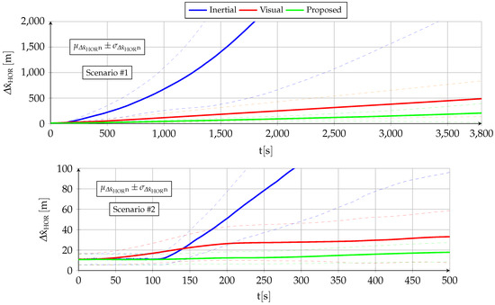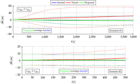 Most VIO packages discussed in Section 3 include in their release articles an evaluation when applied to the EuRoC MAV data sets [64], and so do independent evaluations, such as [65]. These data sets contain perfectly synchronized stereo images, IMU measurements, and ground truth readings obtained with laser, for eleven different indoor trajectories flown with a MAV, each with a duration in the order of 2 min and a total distance in the order of . This fact by itself indicates that the target application of exiting VIO implementations differs significantly from the main focus of this article, as there may exist accumulating errors that are completely nondiscernible after such short periods of time, but that grow nonlinearly and have the capability of inducing significant pose errors when the aircraft remains aloft for long periods of time. The algorithms presented in this article are hence tested through simulation under two different scenarios designed to analyze the consequences of losing the GNSS signals for long periods of time; these two scenarios coincide with those employed in [1,2] to evaluate standalone visual and inertial algorithms. Most parameters comprising the scenarios are defined stochastically, resulting in different values for every execution. Note that all results shown in Section 10 are based on Monte Carlo simulations comprising one hundred runs of each scenario, testing the sensitivity of the proposed navigation algorithms to a wide variety of values in the parameters.