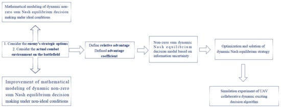 Based on the above analysis, this paper aims at the cooperative confrontation problem of UAV clusters. First, under ideal conditions, that is, the information of both sides of the confrontation is completely accurate and known. Through the situation analysis of both sides, the multi-attribute evaluation of the decision set and the selection of target strategies are carried out to establish a dynamic non-cooperative relationship between the two sides. A zero-sum Nash equilibrium maneuver decision model. On this basis, the ideal conditions are modified, that is, considering the actual environment of the battlefield, including the performance difference of the drones of the two sides of the game, it is impossible for us to grasp the accurate information of the opponent in time, and because the radio environment of the battlefield is relatively complex, there may be data errors caused by ground information warfare forces interfering with our information acquisition. This paper improve the dynamic non-zero and Nash equilibrium maneuver decision-making model. Afterwards, through the improved particle swarm optimization algorithm, the efficient calculation of the Nash equilibrium solution of the non-zero-sum game model is realized, and the optimal mixed strategy of both parties is obtained. Finally, the effectiveness of the proposed method is verified by numerical simulation experiments.