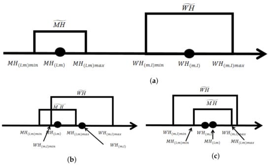 Relative dominance: Assuming that the upper limit of the interval of is higher than the upper limit of the interval of , there are only three cases: and have no intersection (Figure 2a), and have intersection and B is not completely contained in (Figure 2b), is completely contained in (Figure 2c). According to these three situations, this paper defines the result calculated by Equation (19) as the relative dominance of to .
