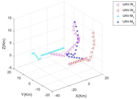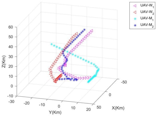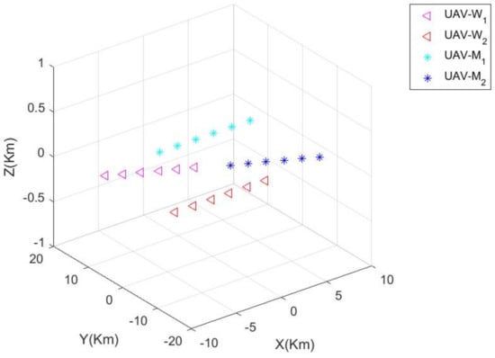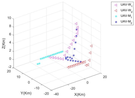 In order to compare the superiority of the proposed algorithm, W uses the “global adversarial strategy” of the UAV cluster adversarial algorithm based on asymmetric uncertain information environment proposed in this paper, and M uses the classical global adversarial strategy based on the maximum–minimum pure strategy []. The following Table 1 shows the initial parameters of the numerical simulation experiment.
