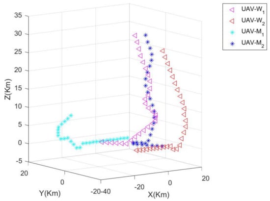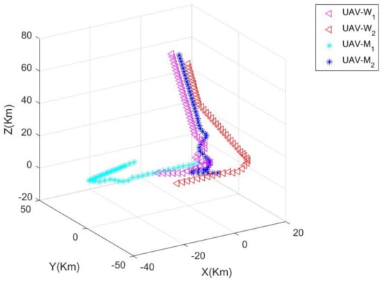 When the first stage reaches the 10th step, adjusts the pitch angle by a large margin in order to increase the advantage of the situation, and quickly raises the height of the UAV. Since is relatively close to , in order to maintain the overall advantage of M and W, also quickly adjusts the pitch angle and follows to reach a higher altitude; while is responsible for continuing to approach to expand its own advantages. At this time, due to the hysteresis of the response, has a greater advantage over ; while is in a tracked state, therefore, has a greater advantage over . In the first stage, the two sides have not yet formed a cooperative confrontation, and are still in the stage of balanced confrontation. The confrontation process of step 10 is shown in Figure 3.