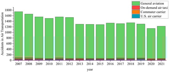 The general aviation industry in the United States is huge and diversified, including drones, light aircraft, helicopters, and private jets. Additionally, it has great flexibility and convenience due to the wide variety of flying ranges. However, its huge scale and complexity bring a large number of accidents and huge challenges to safety regulation. According to Transportation Accidents by Mode, published by the United States Bureau of Transportation Statistics, general aviation accidents account for up to 94% of all air transportation accidents from 2007 to 2021. As shown in Figure 1.