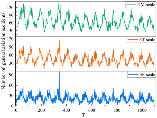 In the time series construction procedure, firstly, the general aviation accident data were cleaned by eliminating missing values and unknowns. Then data filtering was used to screen all data associated with general aircraft that satisfied the conditions of Federal Aviation Regulations Part 91. Finally, the general aviation accident data have been collated in chronological order, yielding a total of 18,480 accident records. With days as the unit, HM-scale is the statistics every half month, ET-scale is the statistics every 10 days, and EF-scale is the statistics every 5 days. Different timescales were selected for classification statistics to construct the time series of general aviation accidents: