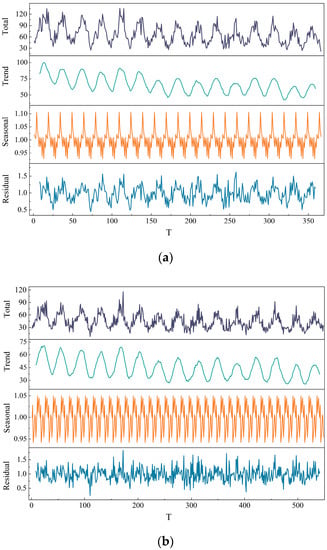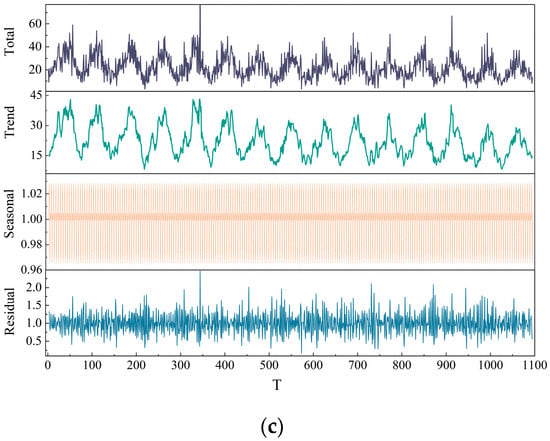 Seasonal decomposition diagram. (a) HM-scale; (b) ET-scale; (c) EF-scale.