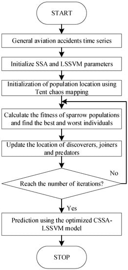 The Least Squares Support Vector Machine (LSSVM) [36] is an improved support vector machine based on statistical theory that can transform the solution of a quadratic optimization problem into the solution of a system of linear equations. Thus, it simplifies the solution of the problem, is very effective in dealing with nonlinear data, and has a high prediction accuracy. The training process of LSSVM involves only a small number of support vectors, so it can efficiently handle large-scale datasets. We utilize the general aviation accident data set over the last 15 years and account for the number of accidents based on the time series. There are 366 (for the HM-scale), 548 (for the ET-scale), and 1096 (for the EF-scale) sample points available for prediction. Yu et al. [37] applied RBD-LSSVM for time series prediction with 279 samples for yearly prediction and 522 samples for monthly prediction. In addition, Sun et al. [38] suggested the VMD-P-(ARIMA, BP)-PSOLSSVM model, which employed 1000 samples of wind speed data as projections, and they both developed optimized prediction results. After the LSSVM training process, the final decision function consists of only a small number of support vectors. In our experiment, 8–25 support vectors are used to process the data set efficiently and accurately. The disadvantage is that the parameters can easily influence the predictions. Therefore, our study is based on the LSSVM model and proposes a chaotic mapping sparrow search technique [39] to optimize the parameters, and it creates a CSSA-LSSVM augmented time series prediction model to predict general aviation accident time series.