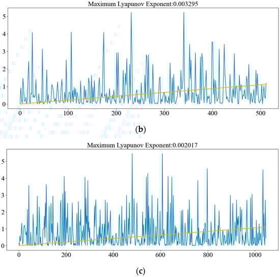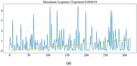 The phase space reconstruction is performed by calculating the embedding dimension m and the delay time τ, and the Lyapunov exponent is calculated to determine the chaotic properties of the time series. The i − y(i) function is displayed using multi-timescale data. In addition, after fitting with the least squares approach, the slope of the line equals the time series’ maximum Lyapunov exponent, as shown in Figure 9.