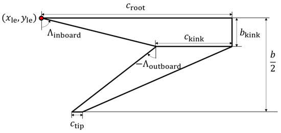The main wing was composed of an inboard wing connected to the fuselage as a strake with a backward-swept angle and an outboard wing with a forward-swept angle. The wing planform was defined using nine design variables, as shown in Figure 2.