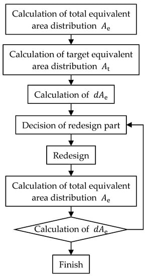 After calculating the difference d A e between the total equivalent area distribution A e and target equivalent area distribution A t of the design solution, we redesigned the design solution to minimize this difference. A flow chart of the low-boom design method is shown in Figure 3.
