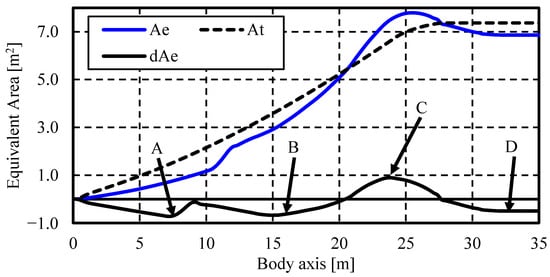 Figure 6 shows the total equivalent area distribution for the Baseline configuration A e , target equivalent area distribution A t , and the difference between them along the body axis d A e . Four large regions of d A e were identified: regions A (0–9 m), B (9–20 m), C (20–28 m), and D (≥28 m). To reduce the strength of the sonic boom, we redesigned the aircraft geometry by minimizing the area enclosed by the d A e curve and body axis. However, region D was not considered in this study. This was because it was not feasible to reduce the area enclosed by the d A e curve and body axis in this region without redefining the weight of the aircraft and target equivalent area distribution.