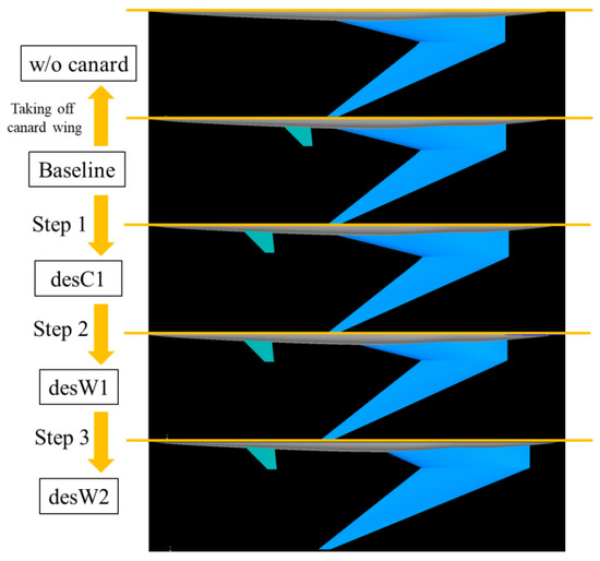 To improve regions A, B, and C in Figure 6, the redesign was conducted three times based on Steps 1, 2, and 3 in the previous section. We named these configurations “desC1”, “desW1”, and “desW2”, respectively. In addition, a configuration without the canard wing, “w/o canard”, was evaluated.