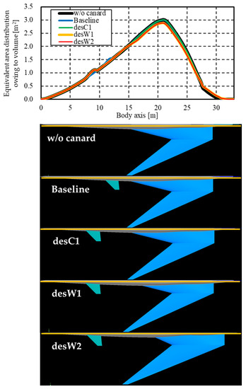 The equivalent area distribution owing to the volume of each configuration is shown in Figure 8. According to this figure, the volume difference before and after the redesign is marginal. The wing volumes of the desW1 and desW2 configurations decreased because the chord length of the wing root, which was thick, decreased.