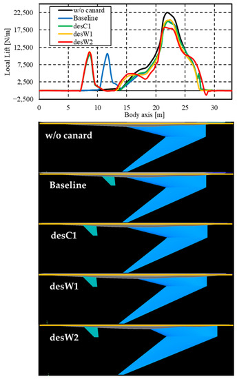 Figure 9 shows the local lift distribution along the body axis of each configuration. In this figure, the first peak of each configuration with the canard wing corresponds to the lift generated by the canard wing. The peak lift for the desC1, desW1, and desW2 configurations was located forward compared with that for the Baseline configuration because the canard wings of these configurations shifted forward. In this study, the area of the main wing, wing planform, and the geometry of the canard wing did not vary. Thus, the lift distribution for all the configurations, which corresponded to the lift generated by the wing, had similar shapes. In the w/o canard configuration, although a lift peak between 7–15 m owing to the canard wing was not observed, the asymmetric fuselage generated a lift of approximately 10 m.