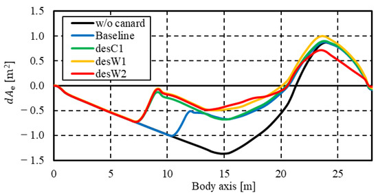 The d A e distribution for each configuration is shown in Figure 13. Regions A, B, and C of the d A e distribution decreased in the following order: w/o canard, Baseline, desC1, desW1 and desW2 configurations. Moreover, the A e distribution approached the target distribution. To quantitatively evaluate the difference between A e and A t , the integrated value of d A e along the body axis was calculated (as listed in Table 3). According to this table, the integrated value of the d A e distribution along the body axis decreased with the performance of the redesign process based on the principles described in Section 4.2. If the integrated value of the d A e distribution is used as an objective function of the optimization problem that can be solved using an evolutionary algorithm (EA), a low-boom configuration is likely to be obtained based on the SGD theory.