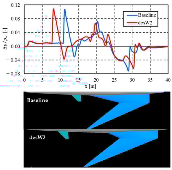 A pressure increase occurred in the Baseline configuration at approximately 16 m that was similar to the pressure increase owing to the nose. In the desW2 configuration, this type of pressure increase shifted to 18 m. This was caused by a shock wave generated from the leading edge of the wing root. In the desW2 configuration, the leading edge swept-back angle and chord length at the wing root decreased. Thus, the pressure increase in the desW2 configuration shifted backward compared with the Baseline configuration.