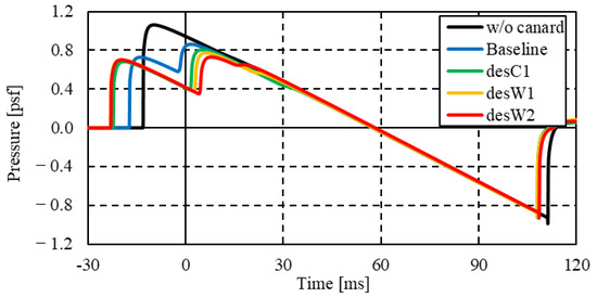The pressure signature on the ground for each configuration is shown in Figure 15. Only the w/o configuration had an N-shaped signature. It is a typical sonic boom waveform with a two-stage pressure jump [29]. Canard-wing-mounted configurations such as the Baseline, desC1, desW1, and desW2 configurations had two-stage pressure jumps at the leading boom. Furthermore, their pressure peak values were lower than those of the w/o canard configuration. The only difference between the w/o canard and Baseline (or desC1) configurations was the presence or absence of canard wings. This revealed that the canard wing could divide the leading boom into two stages and reduce its peak pressure.