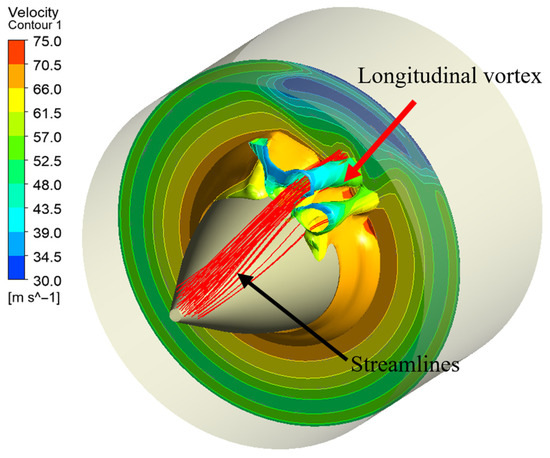 - Numerical simulations of the fan under different circumferential total pressure distortion inflow conditions were conducted using the body force model. Since the working patterns are not alike at different spans, the stretching and compression effects of the longitudinal vortex in the two regions are opposite, resulting in strong circumferential and radial pressure gradients at the junction between the distortion-affected zone and the non-distortion-affected zone, introducing additional mixing losses. It is a unique flow phenomenon that is different from the flow state at both design and non-design points when the fan is operating normally.