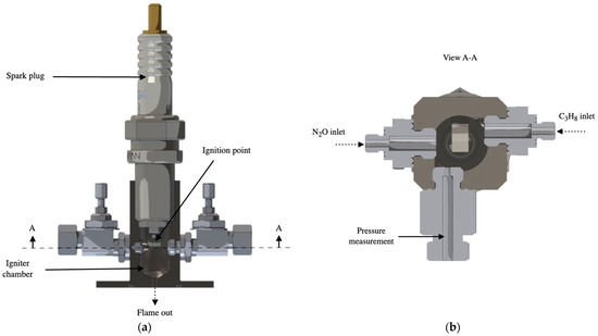 - Conte, A.; Rabinovitch, J.; Jens, E.; Karp, A.C.; Nakazono, B.; Vaughan, D.A. Design, Modeling and Testing of a O2/CH4 Igniter for a Hybrid Rocket Motor. In Proceedings of the 2018 Fluid Dynamics Conference, Atlanta, GA, USA, 25–29 June 2018; pp. 1–14. [Google Scholar] [CrossRef]