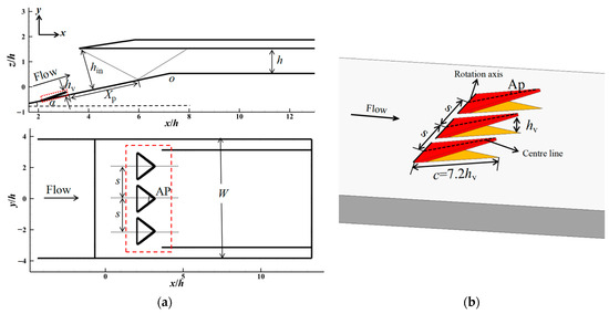 The dynamic MVG was placed in a supersonic inlet with a working Mach number of 3.8 to verify its capability of control. Figure 2 shows the two-dimensional (2D) schematic diagram of the inlet. Its angle of compression α in the first stage was 12°, the height of the entrance to the duct (hin) was 24.9 mm, and its height h was 14.4 mm. The red dotted box is used to highlight the vortex generator location. According to the design principle of the proposed dynamic MVG, the array of dynamic MVGs was arranged upstream of the shoulder of the inlet O to ensure that the point of incidence of shock was at a certain distance from the trailing edge of the vortex generator. According to the reference value of the position of shock incidence in [18,19], for this paper, we selected 10hv as the distance Xp between the trailing edge of the dynamic MVG and the point of shock incidence. The basic configuration of the dynamic MVG proposed in this study was designed using the methods in [14,18], and its configuration is also the basic configuration commonly used by other researchers, and it can ensure the optimal control effect of the vortex generator [11,13,20]. The maximum height of oscillations of the dynamic MVG was hv, an order of the thickness of the incoming boundary layer ẟ, and the spacing between the centerlines of two MVGs was s = 7.5hv. The half-top angle AP of the dynamic MVG was 24°, and the chord length c was 7.2 times the dynamic MVG height hv. The typical geometric parameters are listed in Table 1. Note that the dynamic MVG was a thin plate-type generator with a thickness d of 0.5 mm; the leading edge was chamfered, and there was a 0.1 mm margin between the perimeter of the vortex generator and the bottom wall. The MVG (three in a group) oscillated periodically around the axis of oscillation of the leading edge of the vortex generator at a frequency of 100 Hz.