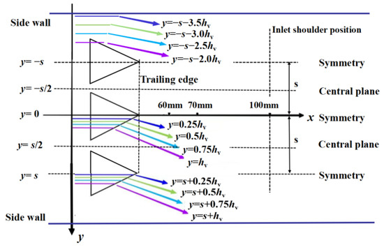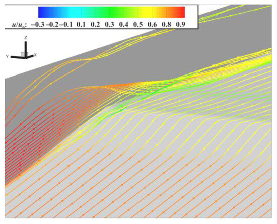 Figure 11 shows the boundary layer at different spanwise positions at x/h = 4.7 without flow control (the relative positions are shown in Figure 3). The fullness of the near-wall boundary layer gradually decreased as the distance between it and the side wall decreased. Separation had already occurred in the near-wall boundary layer (y = s + 3.5hv) at x/h = 4.7, indicating that flow was unstable there, and the zone of separation near the side wall was longer than that of the mainstream flow. Figure 12 shows the streamlines emitted 0.05hv from the bottom and side walls of the inlet. Under the incident shock, the vortices generated near the side wall forced the flow toward the center of the channel, and this enhanced the transverse flow near the bottom wall of the inlet.