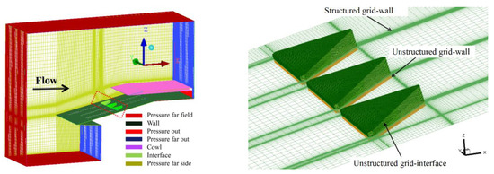 The grid topology of the model of the inlet and the array of dynamic MVGs are shown in Figure 4. The interface divided the entire computational domain into a non-moving domain (on the left) and a moving inner domain (on the right). Mixed grids were used for the calculations to satisfy the requirements of the method to update the dynamic grid. Unstructured grids were used near the vortex generator (right figure) to ensure that the grid could be updated and reconstructed during the motion of the vortex generator, while structural grids were used in the other areas (left figure) to ensure the quality of the grid. Maintain consistent surface mesh distribution at the interface between structured and unstructured grids, and set the boundary condition to the interface.