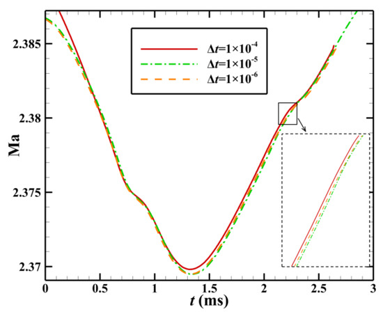 Following the above, unsteady time step (Δt) sensitivity tests were performed to determine the appropriate time step size to achieve efficient and accurate unsteady computation. According to the method in Ref. [33], the preliminary value of the time step is set as 1 × 10−5. At a Mach number of 3.0, the characteristic velocity was defined as u = Mac (c is the speed of sound), and the dimensionless time step (Δt* = Δt × u/hin) was 3.5 × 10−3, indicating that the choice of time step was sufficiently accurate. To further validate the accuracy of the specified time step, three time steps (1 × 10−4, 1 × 10−5, and 1 × 10−6) were chosen for the unsteady numerical simulation verification. Considering the time cost of the calculations, the curve of the Mach number at the exit of the duct at 0–3 ms was calculated for comparative analysis. Figure 5 shows the curves of the Mach number of the exit of the duct at different time steps. It is clear that at time steps of 1 × 10−4 and 1 × 10−5, a specific deviation occurred between the curves. However, the curves of the Mach number with time steps of 1 × 10−5 and 1 × 10−6 coincided with each other. After calculation, it was found that when ∆t equals 1.0 × 10−4, 1.0 × 10−5, and 1.0 × 10−6, the CFL values are found to be 9.8, 0.98, and 0.098, respectively. Hulme et al. [34] pointed out that low CFL numbers can reduce vibration, reduce numerical diffusion, and improve accuracy. Generally, CFL < 1 and near 1 can be taken so that the accuracy of the numerical solution can be guaranteed while considering the calculation speed and convergence. When ∆t = 1.0 × 10−5, CFL < 1 and is near 1, thus meeting the requirements. Therefore, it is reasonable to conclude that a time step of 1 × 10−5 met the needs of the unsteady numerical simulations at the lowest cost.