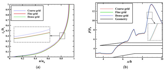 To measure the impact of the number of nodes of the grid on the results of the calculations, three different sets of grids are used in this paper for numerical simulations under the same conditions of incoming flow: the coarse grid, fine grid, and dense grid contained 8.90 × 106, 1.59 × 107, and 2.39 × 107 cells, respectively. The distributions of velocity in the boundary layer at x/h = 4.1 and the curves of the wall pressure obtained by the simulations with the three sets of grids are shown in Figure 6. Although the densities of the dense and fine grids were different, the simulation results obtained when using them were in good agreement with those obtained with the use of the coarse grid. The fine grid was eventually chosen for subsequent simulations to save time and decrease the cost of calculation.